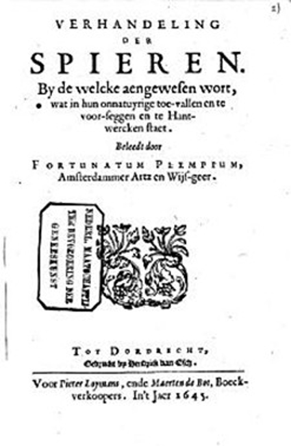 Het is niet vreemd dat Plemp’s’ eerste publicatie over anatomie gaat, een onderwerp dat hij eerst in Leiden, rond 1620, volgde bij Heurnius en Falcoburgus en later, in Padua in 1622 bij Spigelius. Hij woonde, als praktiserend arts in Amsterdam, de anatomische lessen van Tulp bij, o.a. in 1632 (Banga p 233). Aan hem is dit werk opgedragenx[1].