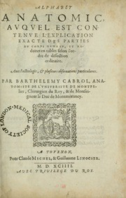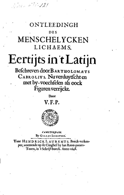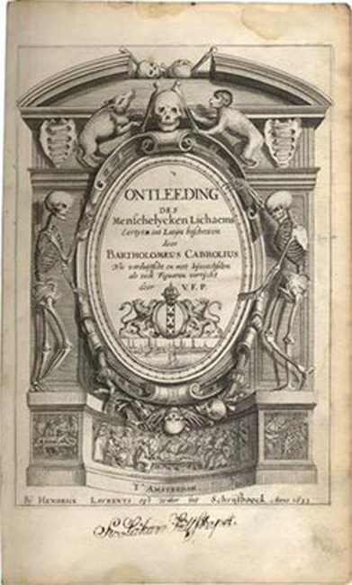 3 Ontleeding des menschelycken lichaems. Eertijts in’ t Latijn beschreven door Bartholomeus Cabrolius. Nu verduytscht en met by-voechselen als oock figuren verrijckt.