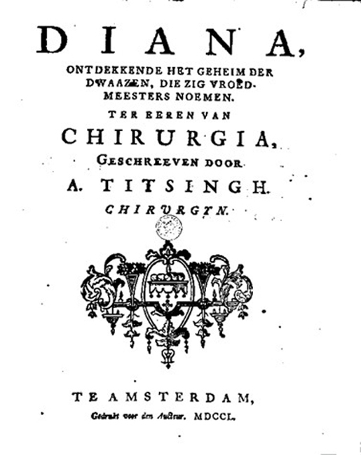 - Titsingh Abraham (1750). Diana, ontdekkend het geheim der dwaazen, die zich vroedmeesters noemen. Amsterdam. google.nl/books/about/Diana_ontdekkende_het_geheim_der_dwaazen.html?id=j6NlAAAAcAAJ&redir_esc=y