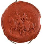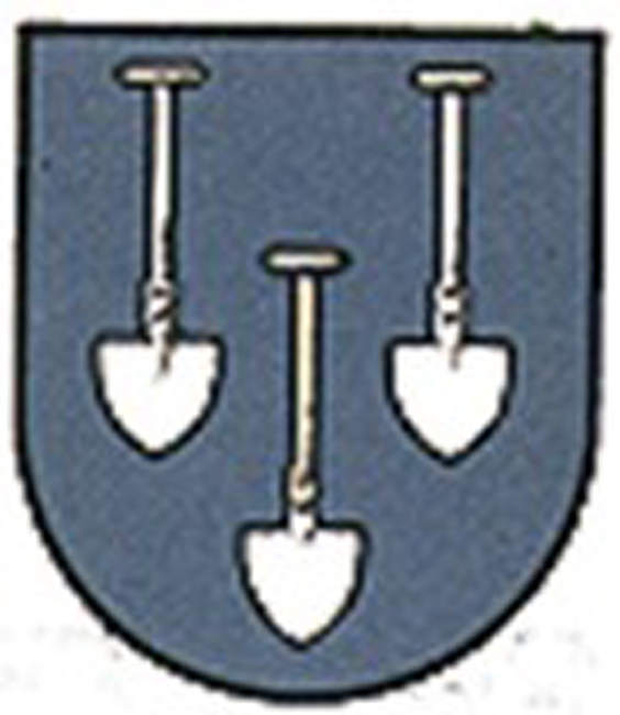 “van boven met het familiewapenschild, te weten, op een azuren schild 3 zilveren spaden, de schop naar beneden”.