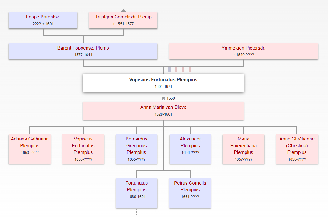 Zijn Nederlandse familienaam is Plemp, voornaam Foppe, verlatijnst tot Plempius Vopiscus Fortunatus.