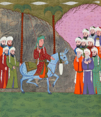 [3] Bron: ‘Alî, mounted on his blue mule and holding a long red staff, is approached by a delegation from the Quraysh tribe, asking him not to return to Muhammad (1594-1595)