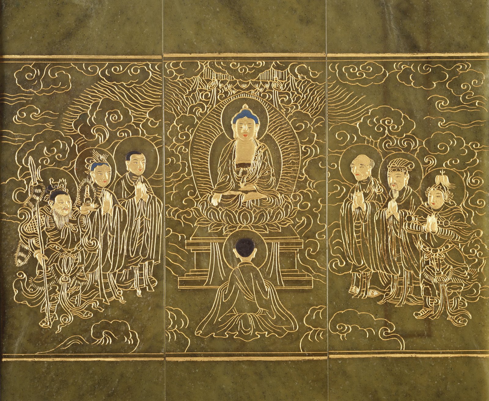 [1] Bron uit het Publieme Domein van de Prajnaparamita Jade book of the ‘Diamond of perfect wisdom sutra’ (Jingang Bore Boluomi Jing; Prajnaparamita sutra), written in Chinese, engraved and gilded on fifty-three folios of nephrite jade; dated 1732, made in China. Chester Beatty Library Collection Chester Beatty Library Dublin.