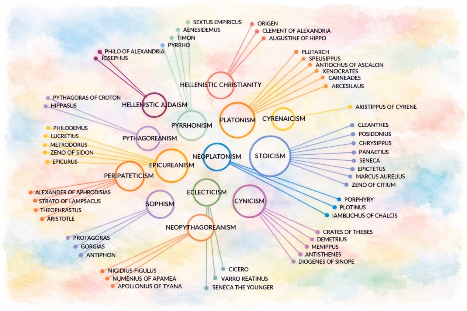 All six schools of philosophy in the Hellenistic period ― Aristotelianism, Cynicism, Epicureanism, Platonism, Scepticism, and Stoicism ― presented themselves