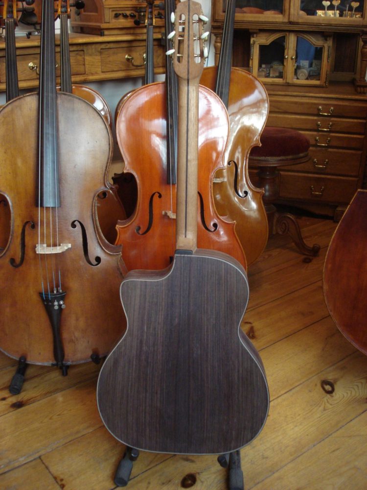 • de snaren waren darmsnaren, ook voor de hoge e-snaar. Het geeft een prachtige klank, maar de omwonden snaren zoals wij die nu kennen geven wat meer kracht in de toon.
