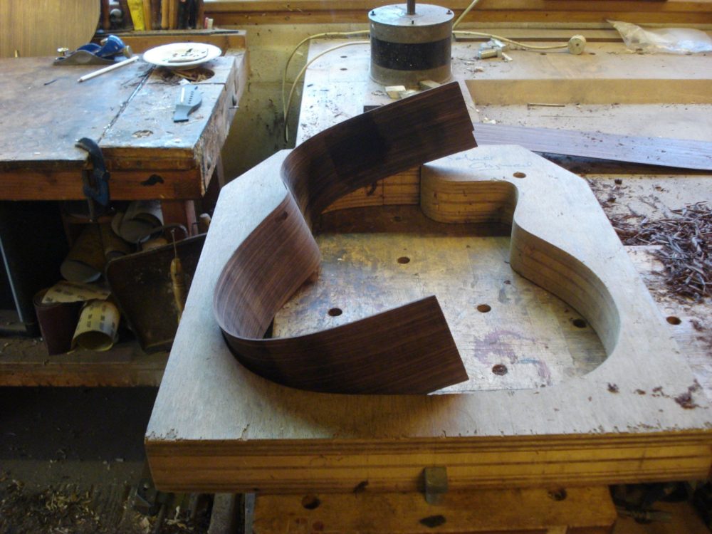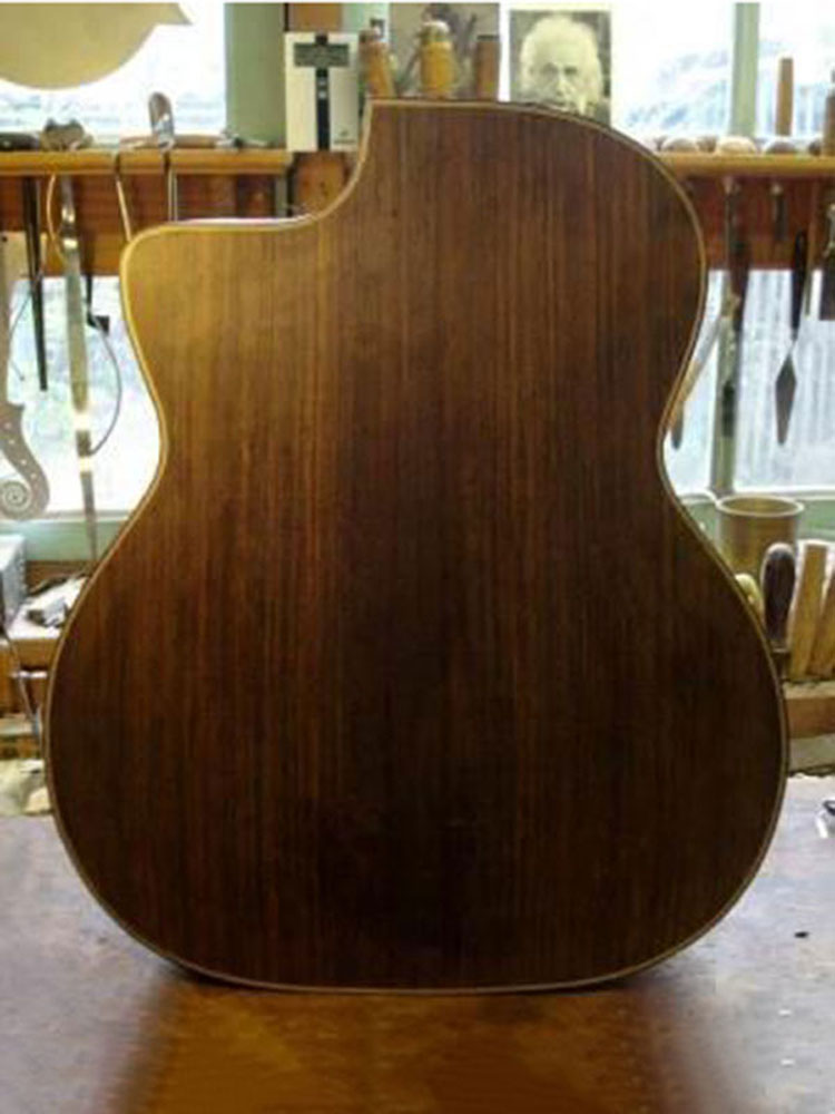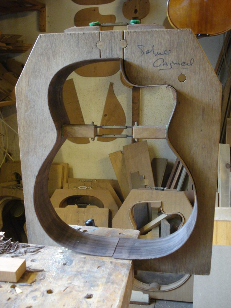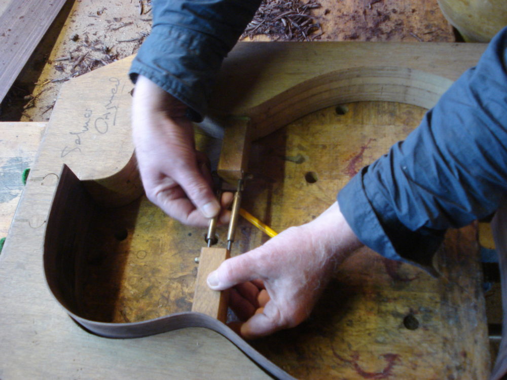 Deze gitaar heb ik gebouwd voor Paul, nadat hij voor een prototype van dit instrument had gekozen. Hij wilde graag een nieuw instrument en hij vond het prettig om zijn voorkeur te geven; welke materialen gebruiken we, wat voor een soort ‘geluid’ zit er in maar misschien nog wel het belangrijkste, hoe speelt dit instrument? Regelmatig kwam hij bij mij over de vloer en waren de laatste vorderingen tot stand gekomen.