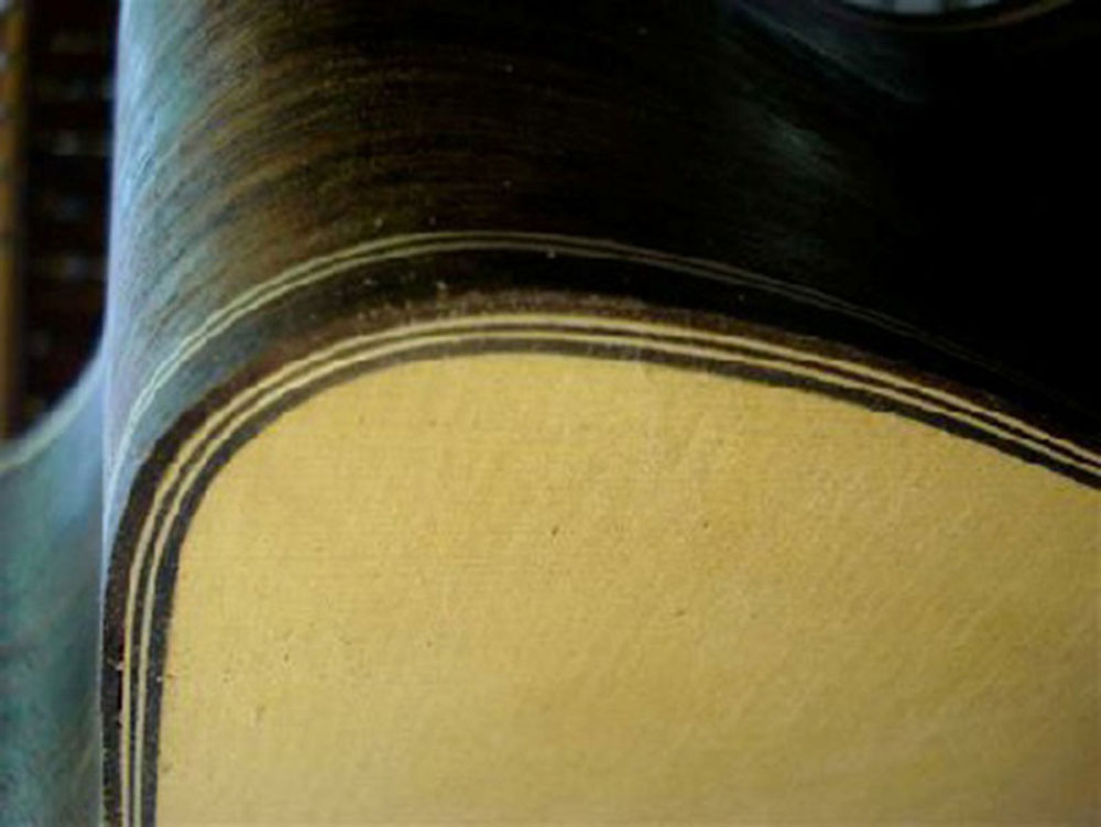 - de toets en snaarhouder: aan de randen gevlamd esdoorn, ingebed met ebbenhout met een ingelegd ruitvormig paarlemoer