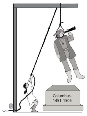 [5] Tekening van Josee Tesser voor (Post)Koloniale Waarden — Cariben en Latijns-Amerika. Dit boek is van de hand van Fred de Haas.