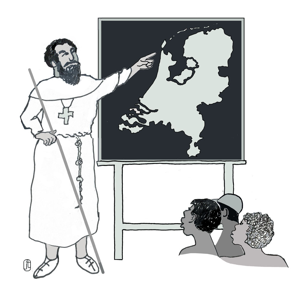 [5] Tekening van Josee Tesser voor (Post)Koloniale Waarden — Cariben en Latijns-Amerika. Dit boek is van de hand van Fred de Haas.